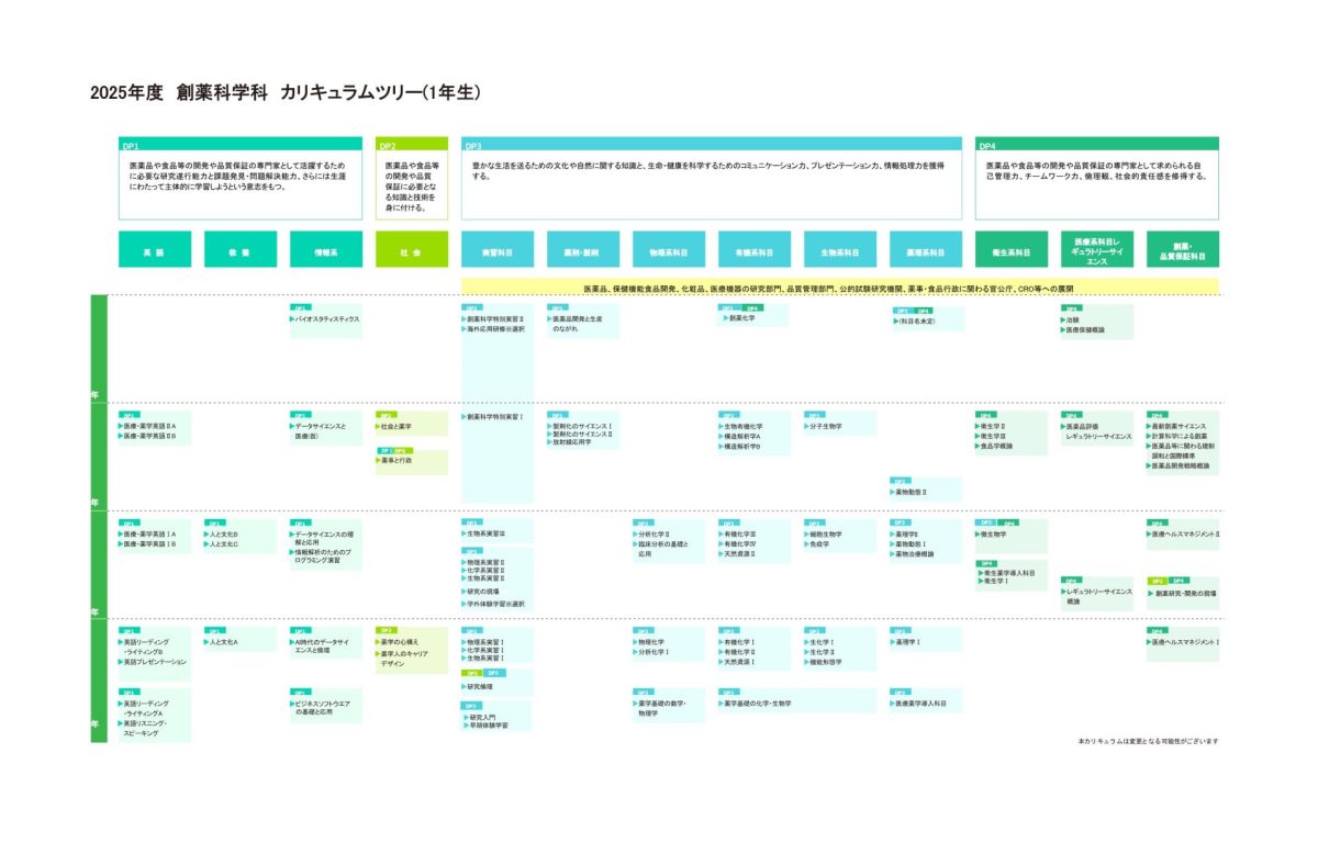 本学の特徴である薬学研究・実習科目と同様に、ライフサイエンス、化学系薬学、衛生化学、医療薬学など、薬学の軸となる基礎科目の講義も、より深い実践知識が学べるものとして強化。創薬サイエンスの最前線である、AI創薬・保健機能食品の開発・データサイエンス等に関する科目を追加・強化しました。特に、コロナウイルス感染症の流行でその重要性が社会的に認識されたレギュラトリーサイエンス※の科目を充実させました。